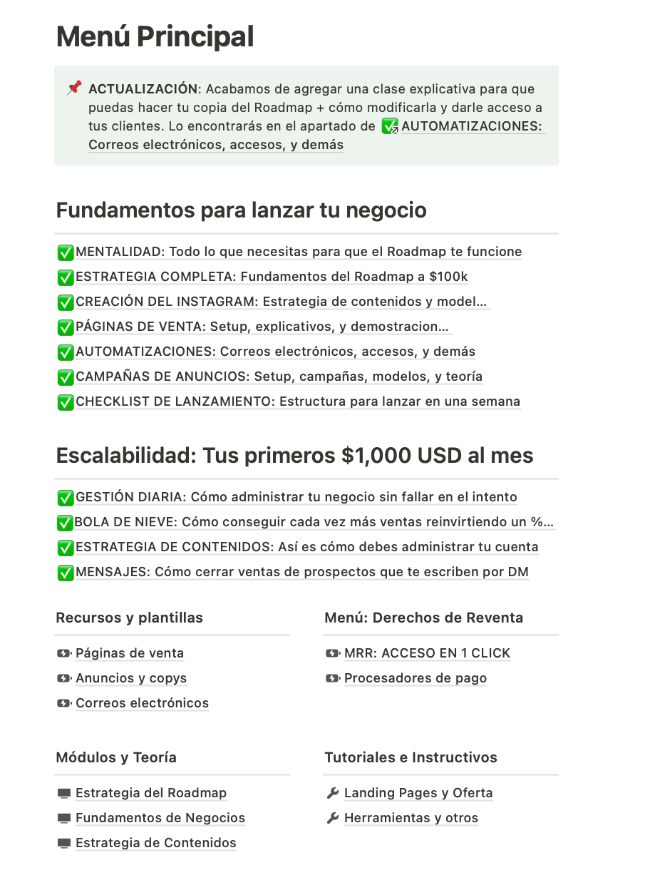 Accediendo a la Hoja de Ruta 100k obtienes un negocio digital pre-armado, (en sí, un curso con derechos de reventa + un sistema de ventas) preparado para generar ventas a diario.